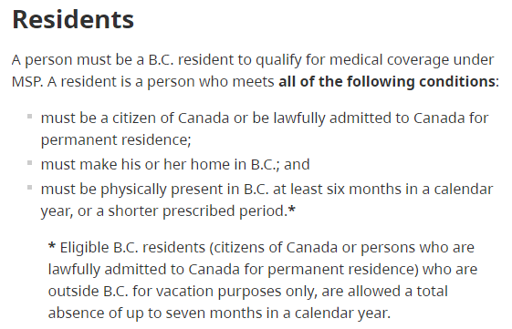 注:有资格的BC省居民(加拿大公民或永久居民),如果是出去度假,在BC省外可最多待7个月并不失去BC省居民身份。