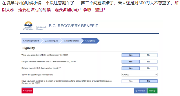 在福利金申请的第四步(就是决定申请人是否有资格的这一步),小编当时把第二题“Did you become a resident of B.C. after December 31 2019”看错了。根据小编自己的情况应该是No。