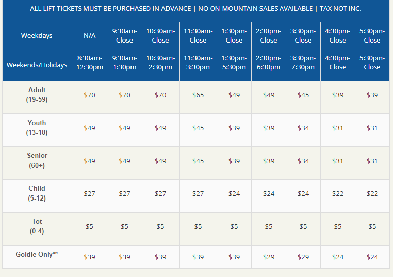 价格:成人全天票$107刀,提前订票、以及购买多日联票、季票有折扣,另外上课或者租借设备还会享受10%-35%的折扣。