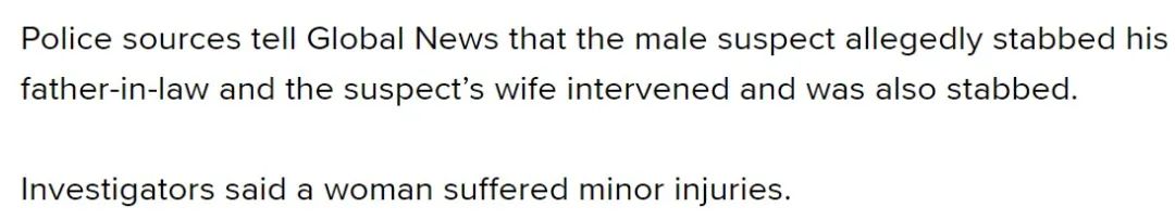 Zhang姓老人是Luo某的岳父,不久前持游客签证来到加拿大探望女儿女婿一家。12月21日晚饭餐后,三人在万锦市的家中发生争执。盛怒之下,Luo某抄起一把刀具连续向Zhang老捅去,几乎刀刀刺中要害。