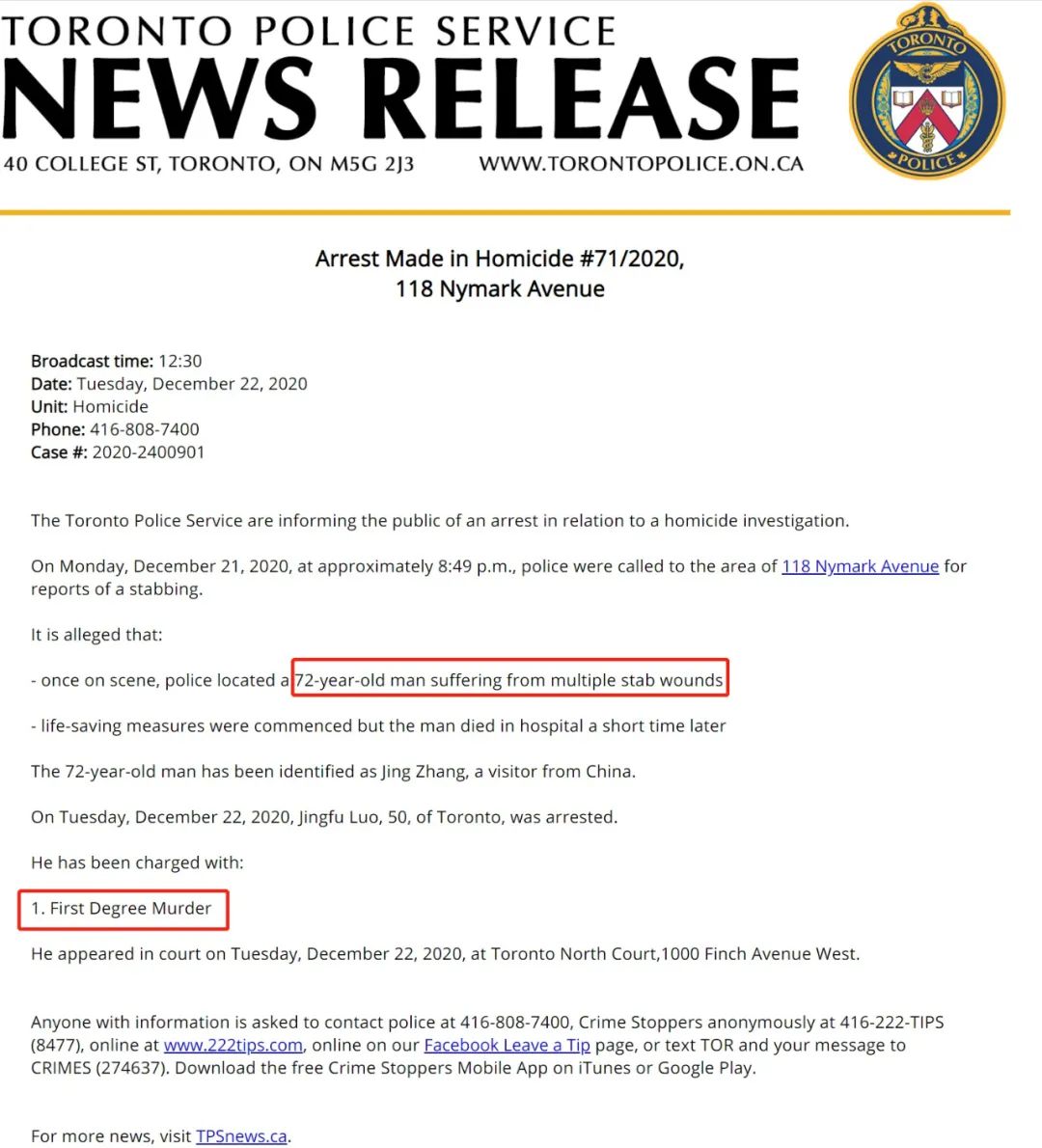 据多伦多警方当地时间12月22日中午12时30分发布的报告,警方已于当日拘捕犯罪嫌疑人Luo某,并指控其犯下一级谋杀罪。Luo某已于12月22日在多伦多法庭出庭。