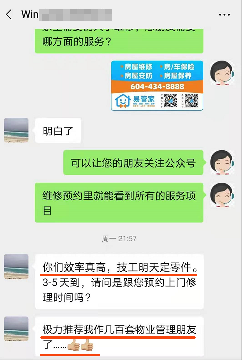 此外,我们的客服MM也会对技工的每一次服务进行回访。这样做一方面是为了保证客户反馈信息的畅通,另一方面对签约技工的服务也能起到监督的作用。随着易管家服务项目范围的不断扩展,在温哥华的知名度不断提升,得到越来越多客户朋友们的广泛好评。很多朋友的房屋遇到问题,第一反应就是找易管家技工来服务。但是一些无良人员,谎称自己是易管家签约技工,为客户提供服务。更有甚者直接盗用易管家品牌和LOGO进行宣传和商业行为。这样的行径不仅侵害了易管家的声誉,更是严重损害了易管家客户的利益。