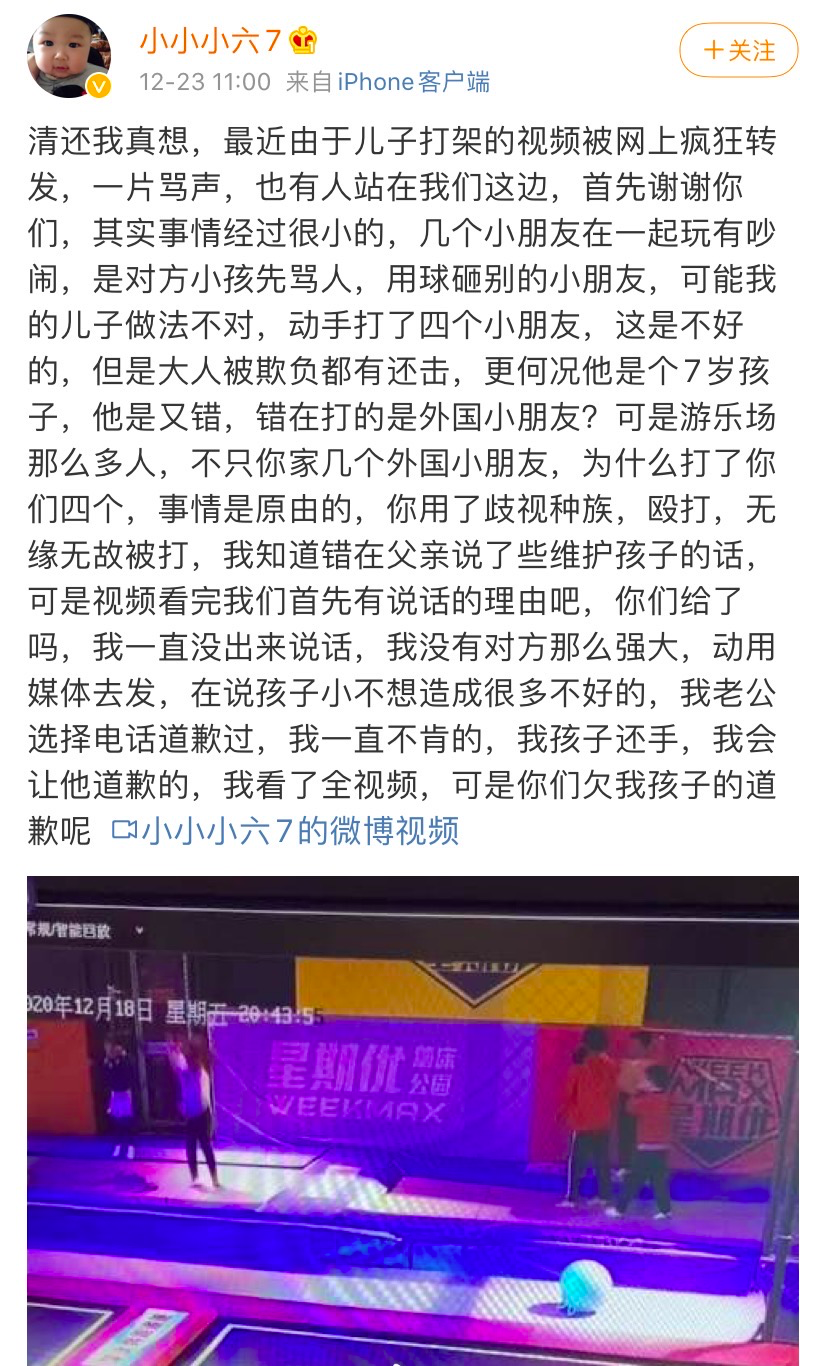 但是@小小小六7也明确,我们是愿意道歉,但无故发布“恶意剪辑”的外国母亲必须给一个说法。