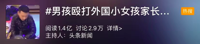 所以在微博上,话题#男孩殴打外国小女孩家长拒道歉#发酵到1.4亿的阅读量。