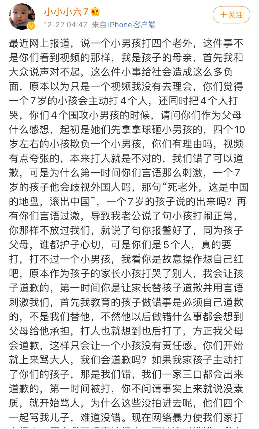 男孩母亲@小小小六7坦诚,自己从来没有灌输给他什么种族思想,都是教他不要欺负别人,毕竟7岁已经开始住校了;