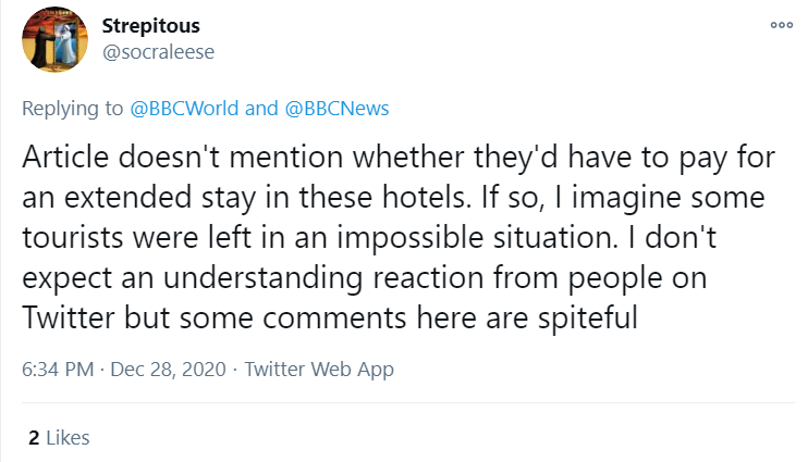 这条留言的意思就是,明知道疫情仍在蔓延,但英国游客一样有顶着风险去旅游的“自由”,另外,在行使这种“自由”出现问题时,你还不能让我承担任何的成本。虽然我给你们带来了麻烦,但如果你批评我,你们就是“怀有恨意”。