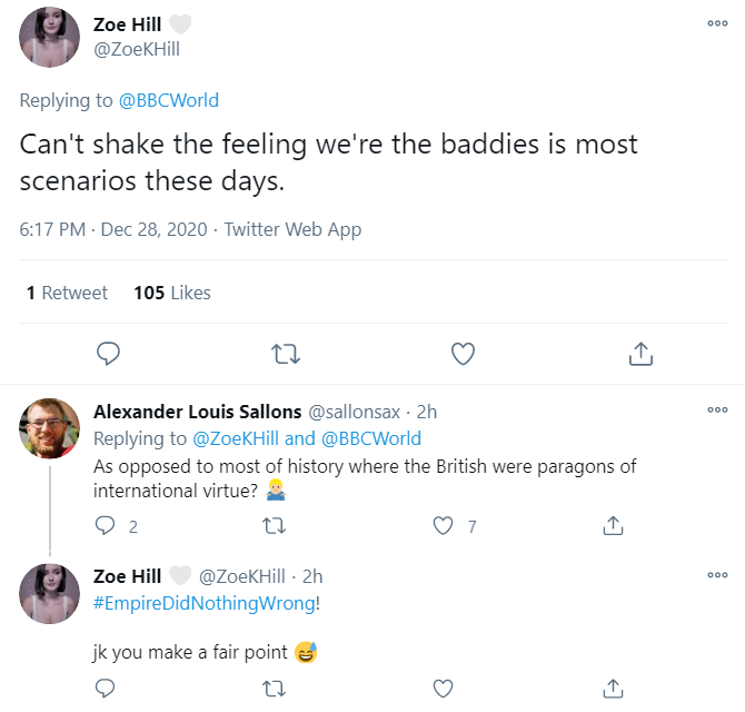 另一个英国网民调侃回复到:“难道在历史上,我们一直都是国际道德标兵吗?”