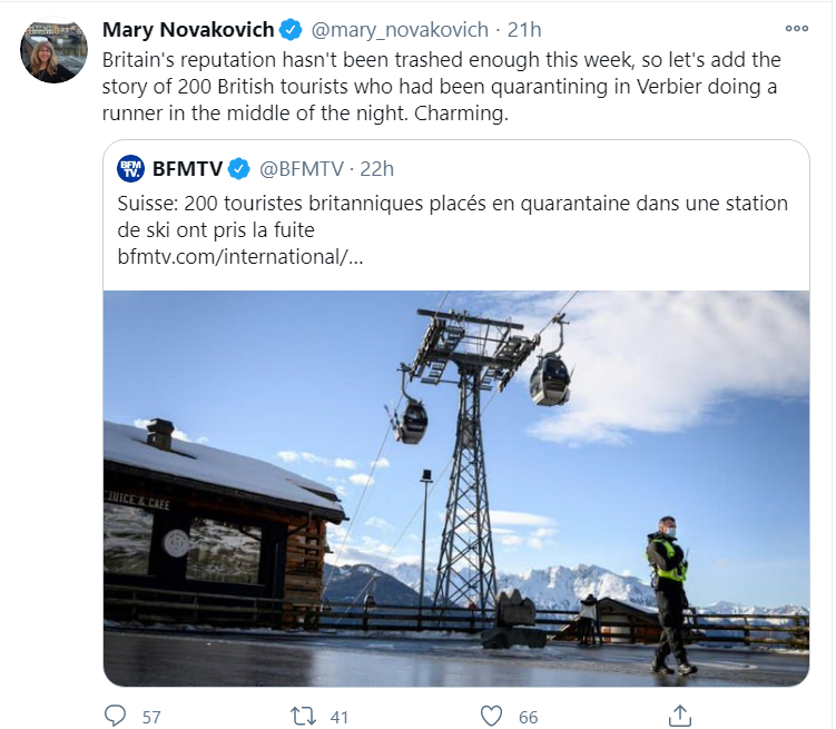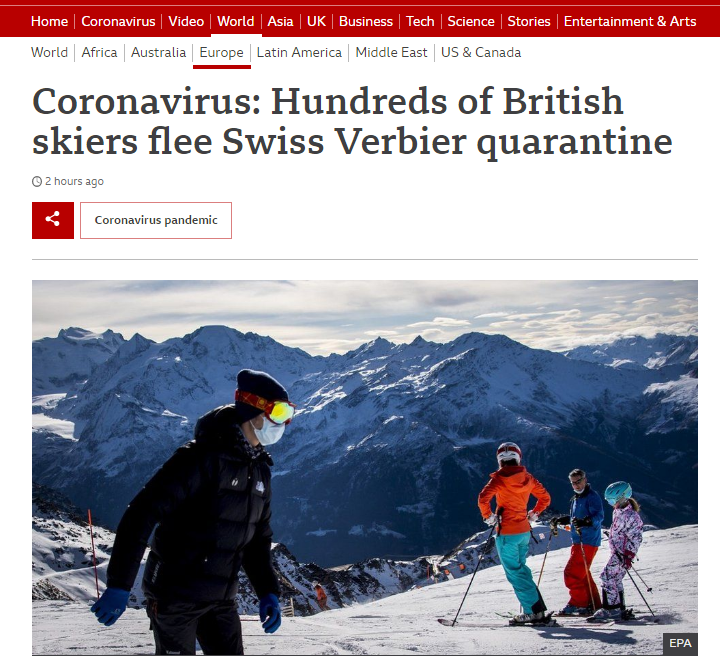 此前多家外媒曾报道,在瑞士韦尔比耶滑雪度假村,数百名英国游客为了逃避隔离而集体逃走。而在最新报道中,关于这批英国游客缺德的细节也被逐渐揭露了出来。