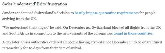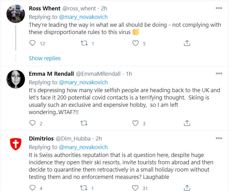 滑稽的是,就在事件发生后不久,瑞士当地政府一名发言人还对英国游客逃跑表示了“理解”,因为当地政府提供的隔离设施较为简陋。没想到,上面这些“顺坡下驴”、把责任甩给瑞士政府的英国网民,就是这样“回报”这位宽宏大量的瑞士发言人的。