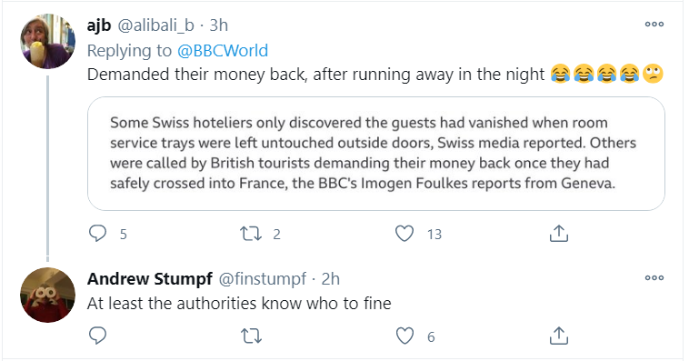 这些英国网民“没良心”的发言让包括瑞士网民在内的许多人大为愤怒,一条最为辛辣的评论是从BBC的报道中发现了一个“亮点”:这些英国旅客在成功逃跑到法国后,还以自己“提前退房”为由,要酒店退还自己付的房费。