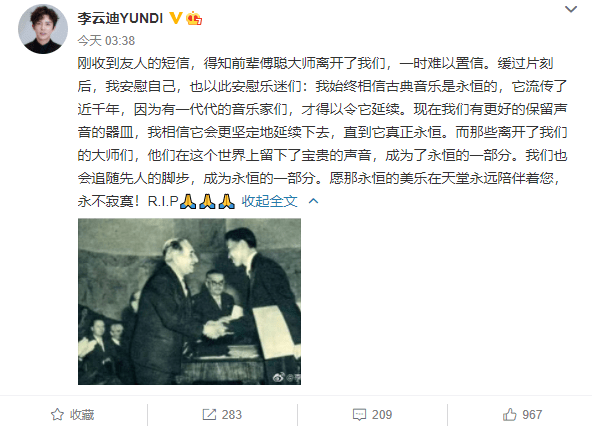 著名钢琴家李云迪凌晨发文悼念傅聪。