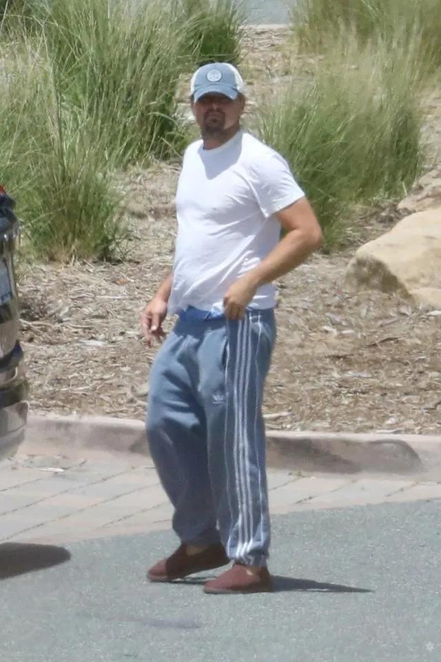 如今46岁的小李子一如既往地浪费颜值,简单的白T恤搭配蓝色运动裤,脚踩老年平底鞋,颇有点退休老大爷的感觉。