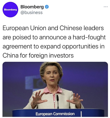 彭博报道指出,中欧领导人计划12月30日宣布协议达成,这将标志着双方高层政治领袖对此协议的支持,这项协议还将涵盖环境可持续性等内容。