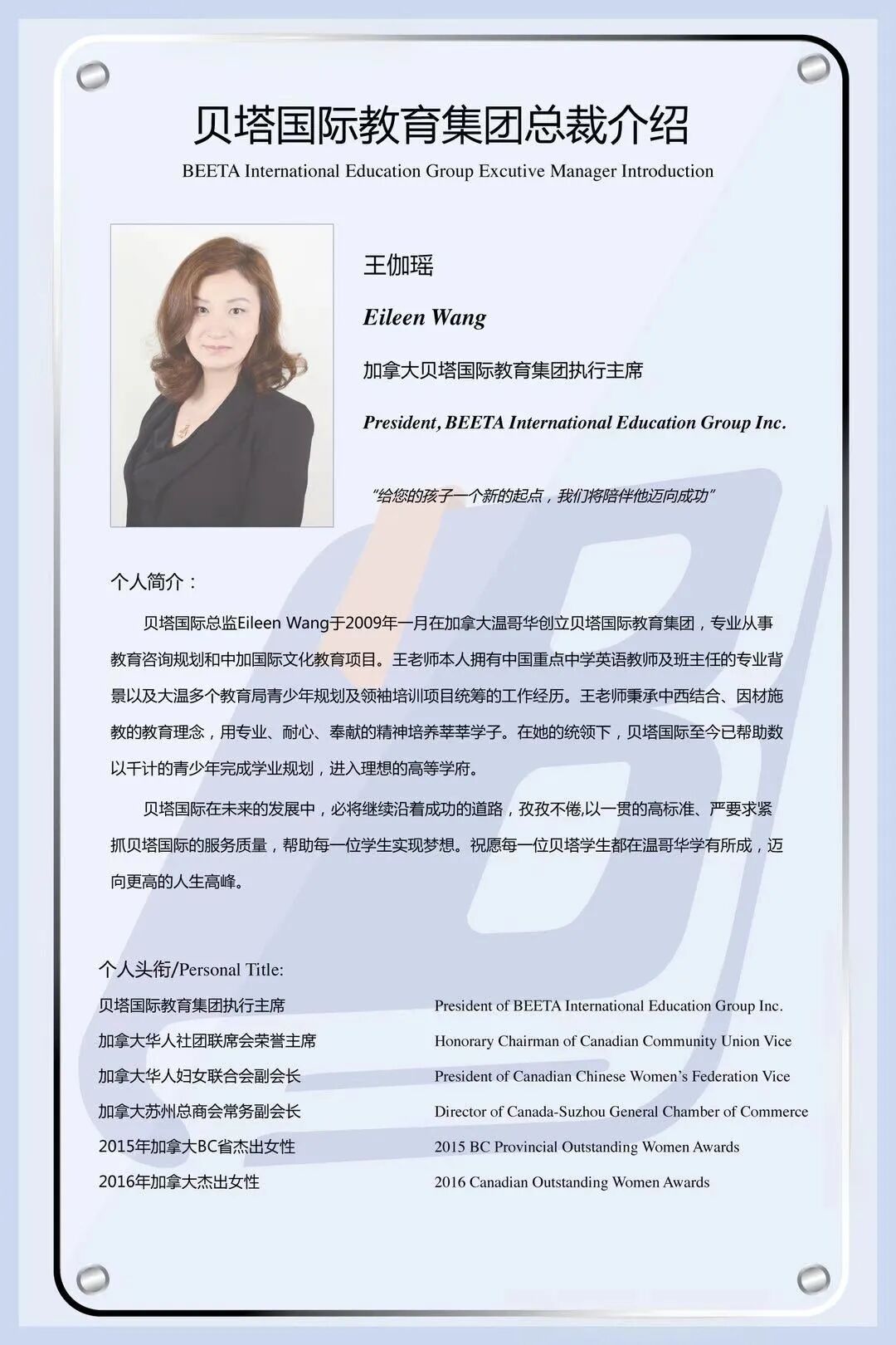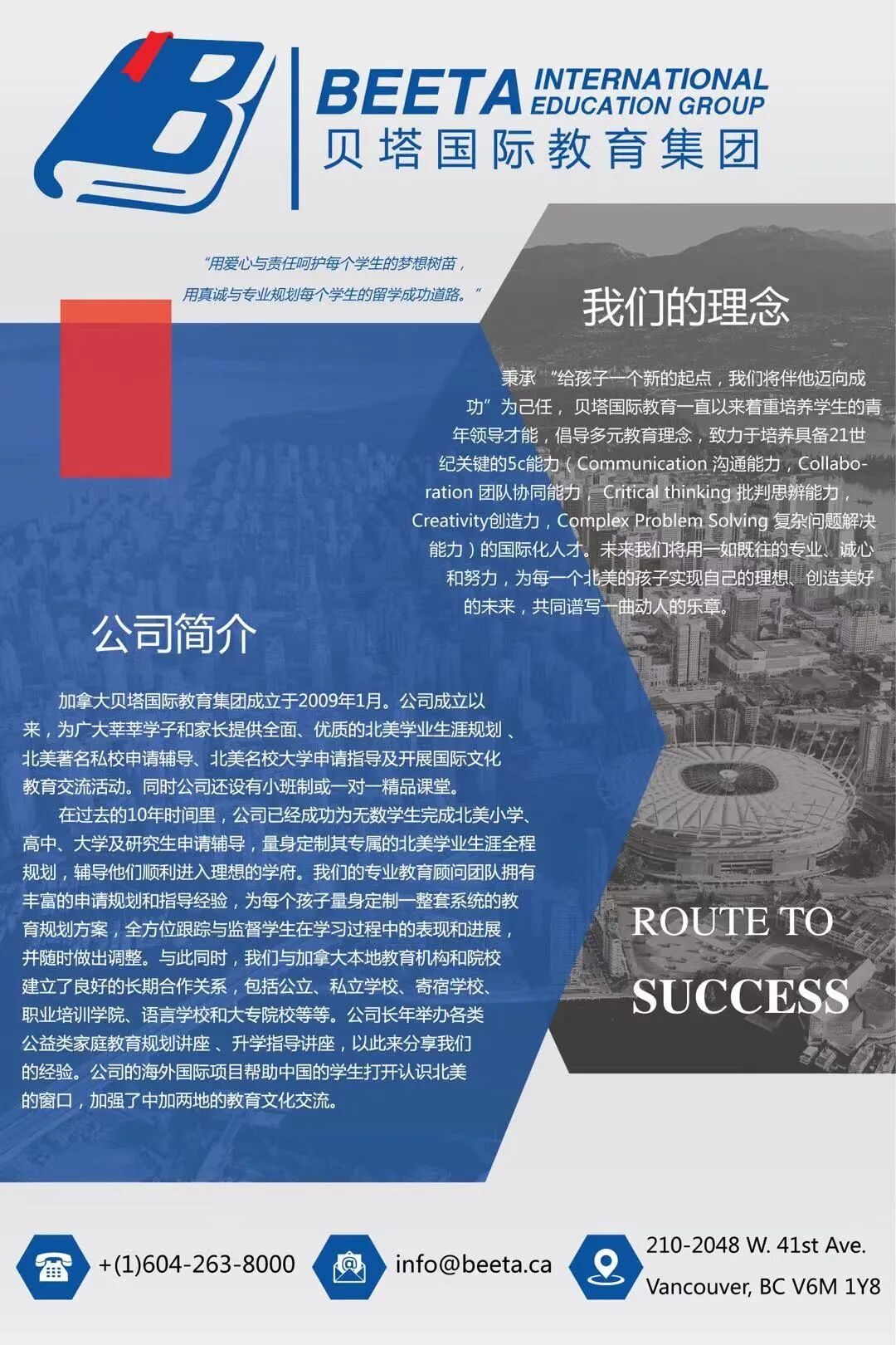 公司经加拿大不列颠哥伦比亚省政府批准注册,同时是BC省商业及消费者保护委员会(BPCPA)会员。公司拥有一批经验丰富、业务熟练、多语种的专业团队,公司洞察行业最新动态,致力于为旅加人士出行、旅行提供专业化解决方案。