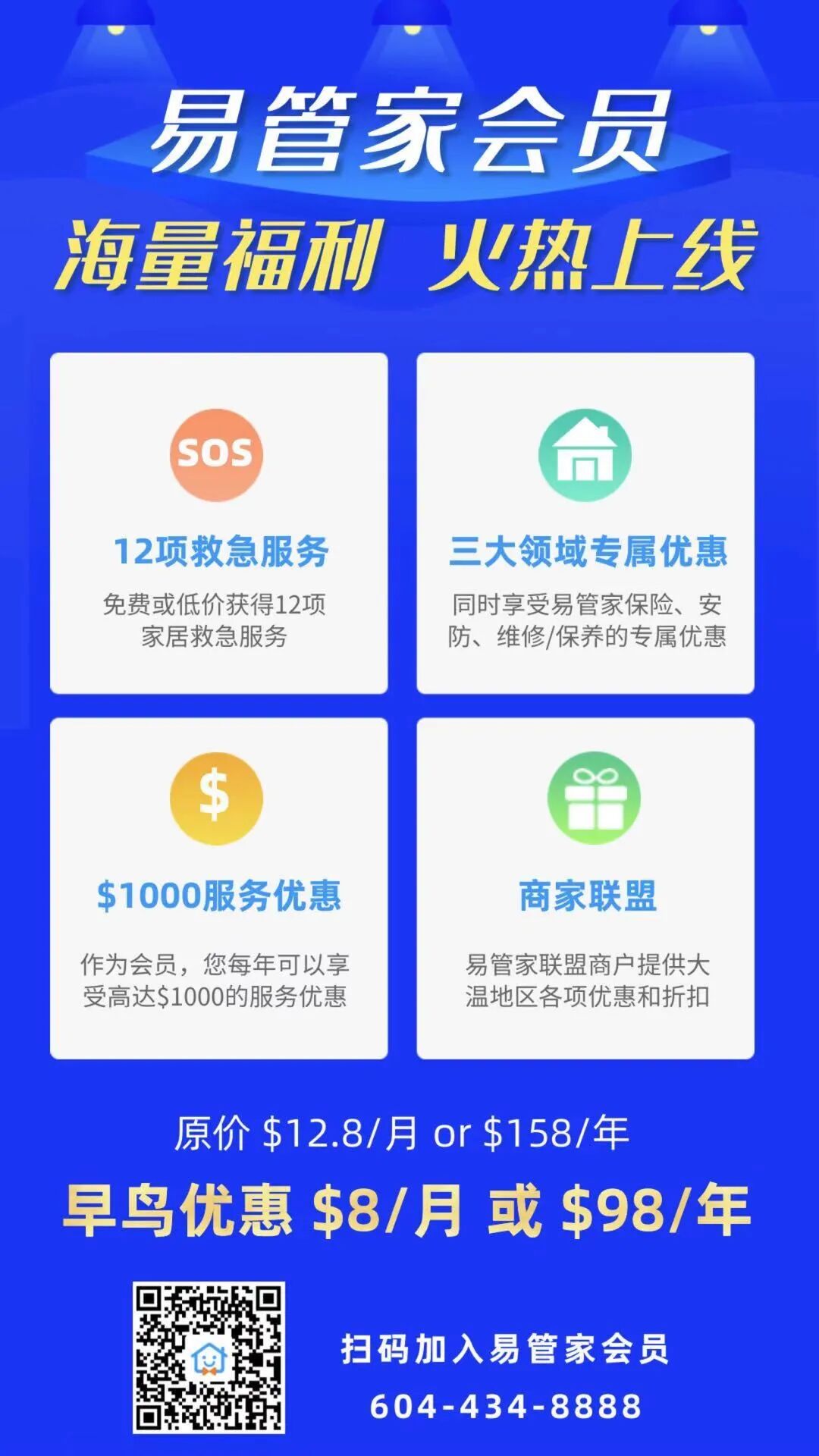 终于上线啦!突然停电、车库门打不开、水管爆裂、没热水,不用怕,加入易管家会员,统统立刻解决。十二项常见的家居救急服务,您可以享受多至五折的优惠!每年还可免费使用一次救急服务,不要太划算哦!更可享受易管家保险、安防、维修/保养三大领域的专属折扣,每年高达$1000的服务优惠。易管家还将利用自身互联网公司优势,倾力打造大温地区集吃、喝、玩、乐、购为一体的商家联盟。当您在大温地区外出就餐或娱乐时,即可获得由商家联盟提供的各项优惠和折扣,还有易管家会员专享的优质团购!还在等什么,快点注册成为易管家会员吧!特别推出限时特价,年费从$158 减至$88, 太划算了!房屋大小事,放心易管家!