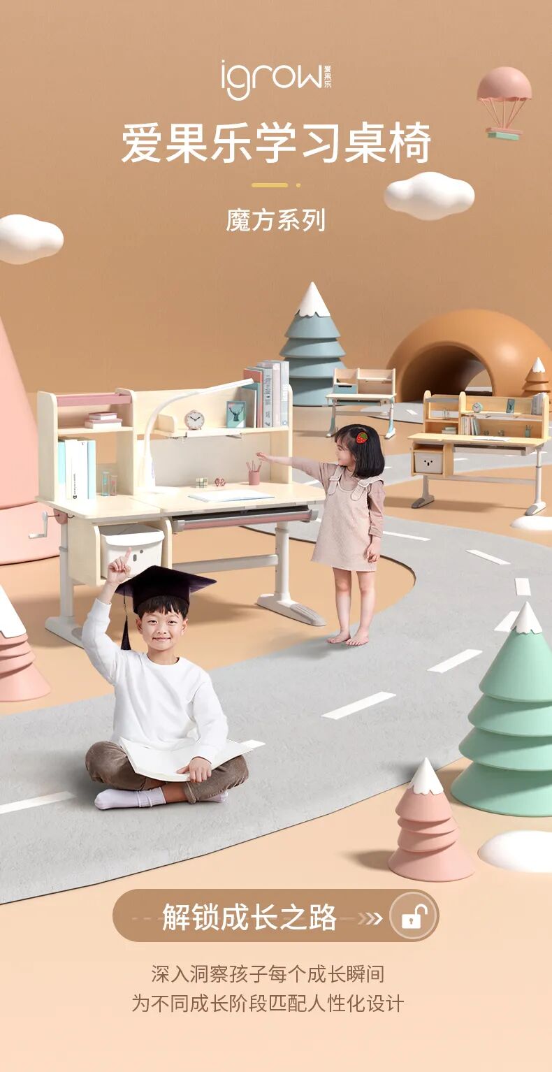igrow爱果乐起源于丹麦,是集智能学习产品设计研发、生产制造、销售运营和品牌发展于一体的现代化企业。在中国拥有超600家线下实体门店,年销售额过十亿;连续五年荣获天猫儿童学习桌椅类目销售额第一,已成为儿童学习桌椅行业领军品牌。爱果乐以“儿童人体工学学习桌椅”为市场切入点,近年来研发了多个系列可多维调节(及电动调节)的人体工学学习桌椅;2020年,爱果乐首创了儿童专用垂直照明智能护眼灯,在产品上实现了儿童科学护眼与儿童科学学习坐姿的一体化;未来,爱果乐将持续深耕学习场景,加快推动智能硬件与儿童教育内容在人体工学学习桌椅上的深度融合,打造集健康学习行为规范与学习内容辅导于一体的儿童居家学习智能化解决方案,打造儿童居家学习的新一代智慧课堂;同时探索更多儿童家居空间场景,为全世界儿童带来更健康的生活方式,成为全球儿童家居行业领导品牌。