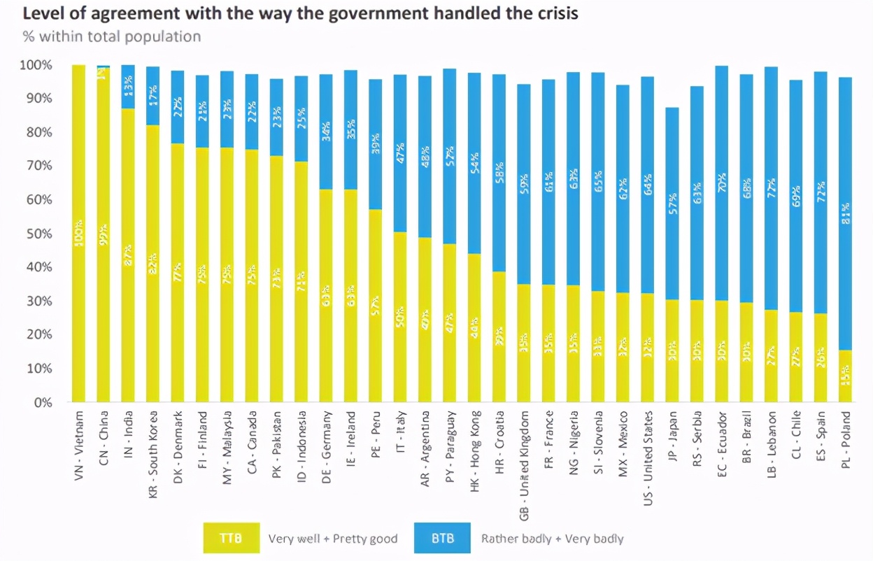 关于政府在疫情中的表现,越南和中国的民众最为满意,分别有100%和99%的受访者对政府的措施表示满意。75%的加拿大受访者表示对政府的抗疫工作满意。
