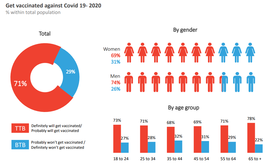 Leger近期发布的一份民调显示,在全部受访者中,大约有71%的民众愿意接种疫苗。男性受访者中有74%表示会接种,女性受访者有69%。