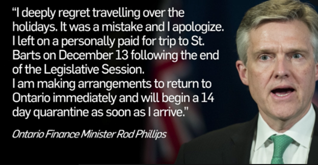 安省财政厅长Rod Phillips由于近期在加勒比岛度假引起民众不满,他称对自己的行为“非常后悔”并将尽快回到加拿大。