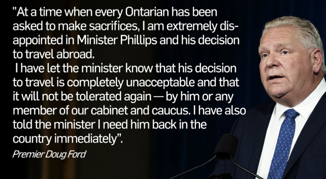 昨天(29日),省长福特表示,他一直在呼吁安省民众留在家中,但是Phillips却在国外度假,他表示“非常失望。”