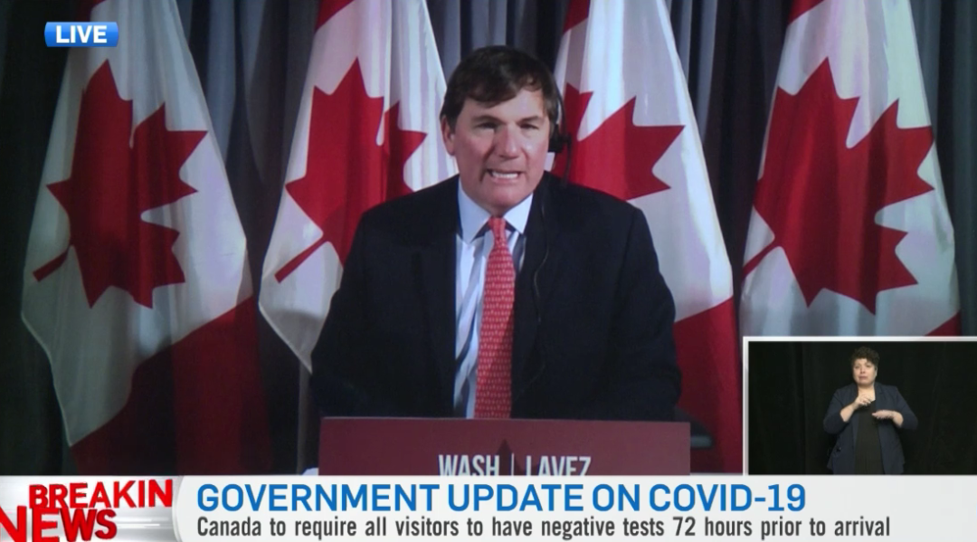 可能鉴于无法强制阻止人们出游,今天在渥太华的政府新闻发布会上,政府间关系部长Dominic LeBlanc宣布加拿大将要求所有入境者必须提供72小时内的阴性证明,并且严格遵守14天的隔离要求。