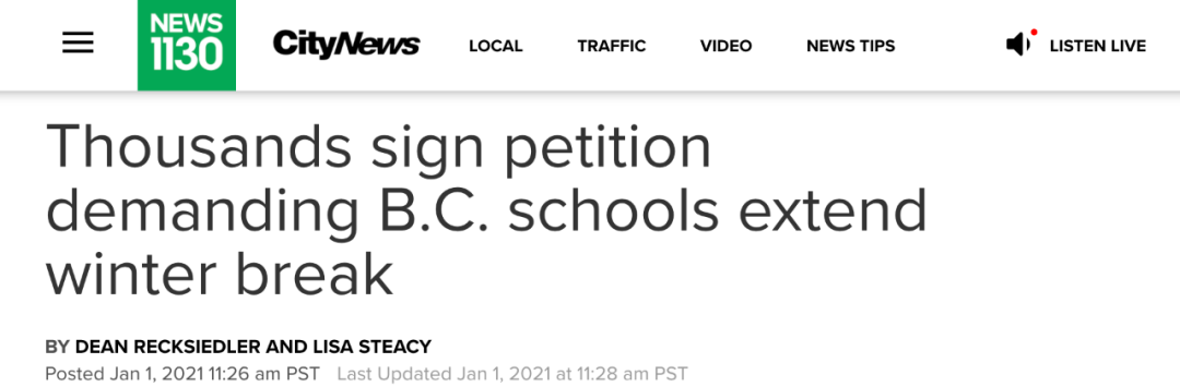 民众欢度新年假期的同时,疫情的蔓延的速度却并没有减速。尽管卫生官邦妮·亨利(Bonnie Henry)采取了新的健康措施,但感染人数仍在继续增加。疫情迟迟不见好,很多家长都开始担心自己孩子校内的安全问题,许多家长希望学校可以重新制定新的安全保障计划。可以确保学生安全返学,目前已有将近3000名家长在网上向省府请愿,要求延长两周寒假。