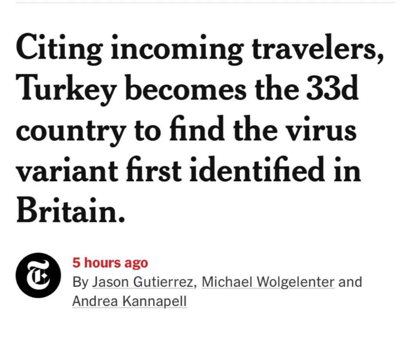 自从英国14日向世界卫生组织报告发现这种变异新冠病毒以来。截止到今天,全球已有33个国家发现了新变异病毒。加拿大从20日午夜起就禁止来自英国的客运航班入境,禁令目前将持续至明年1月6日。加卫生部24日宣布,过去14天经由英国或南非来加的所有旅客将接受“二次筛查和隔离安排审查”。