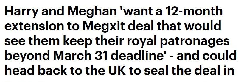 意思似乎是到今年3月,他们自认为还不能脱离王室支持,彻底在美国站住脚。不过王室也不是公共厕所,说进就进,说出就出。王室会对这个要求进行评估,尤其会调查今年哈里和梅根与网飞,Spotify的巨额合约,和他们的生活现状。