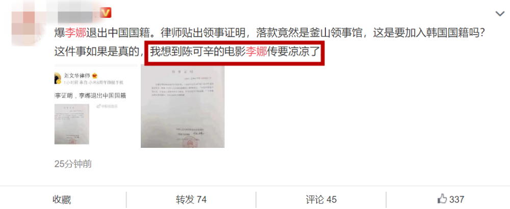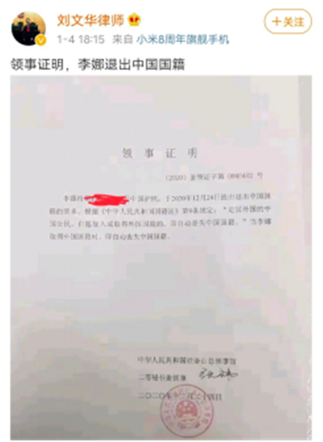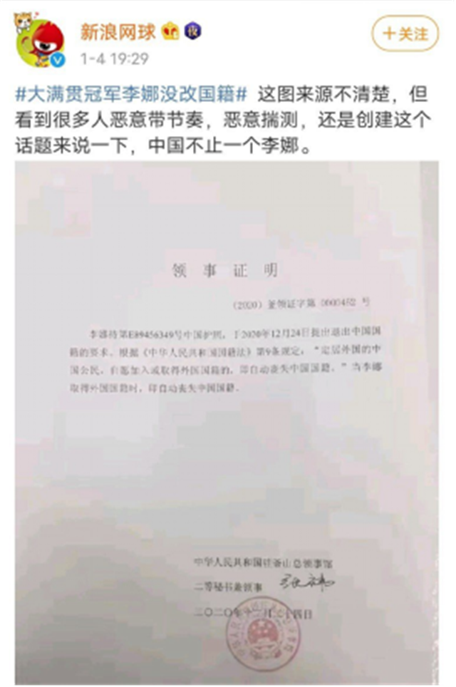 1月4日,有律师晒出一张领事证明的照片。照片中显示,李娜即将退出中国国籍,并且加入韩国国籍。该律师还表示,这是由领事证明了的,李娜确认已经退出了中国国籍。消息一出,立刻引起了轩然大波。