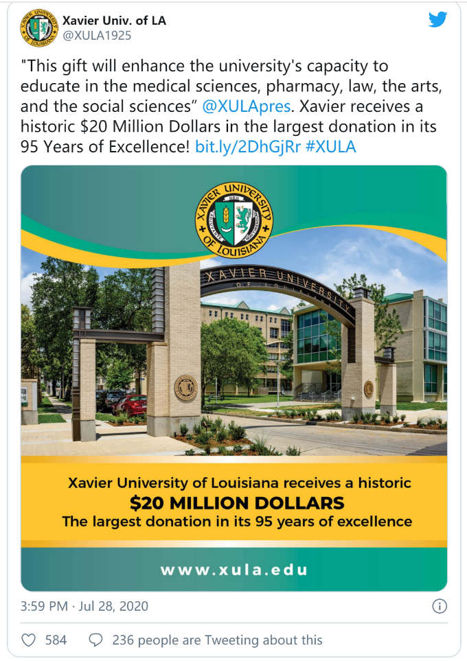 到目前为止,斯科特已向传统黑人大学、社区和技术学院以及为美洲原住民、妇女、城市和农村学生服务的学校进行了捐赠,并敦促其他人捐款给灾难慈善中心(the