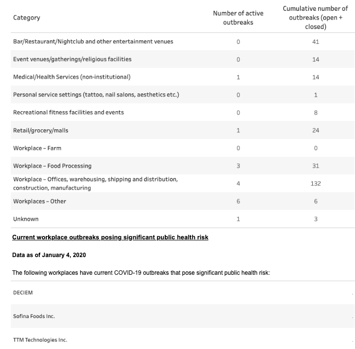多伦多首席德维拉博士说,卫生局将从今天起发布有关工作场所爆发疫情的新细节,每周四更新。