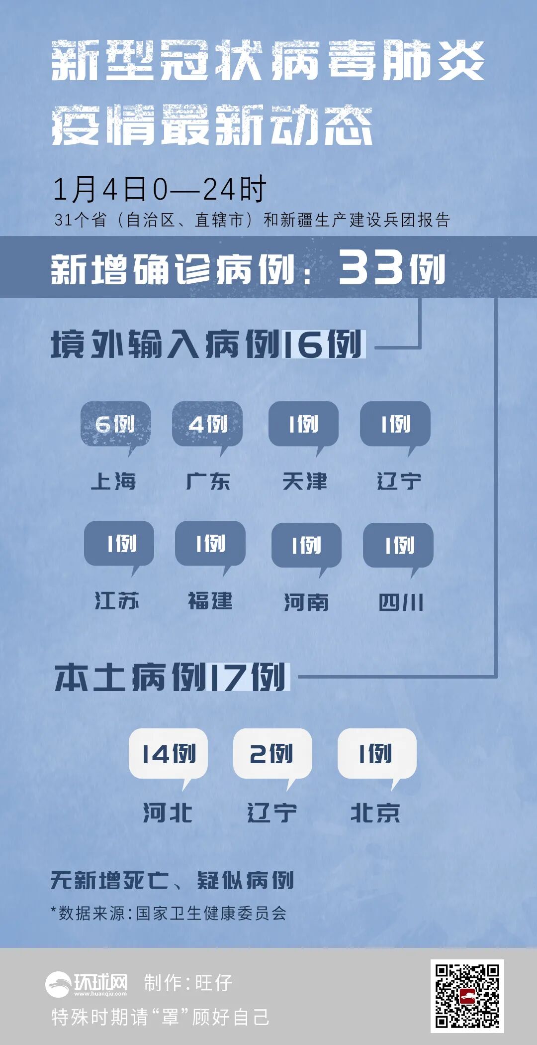 2021年1月4日0—24时,河北省新增14例本地新型冠状病毒肺炎确诊病例,其中石家庄市报告11例(2例为无症状感染者转为确诊病例),邢台市报告3例(1例为无症状感染者转为确诊病例)。无新增死亡病例,无新增疑似病例。