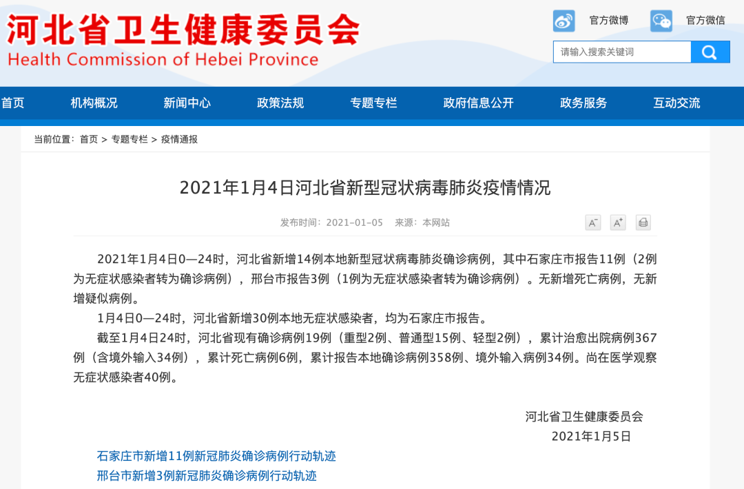 截至1月4日24时,河北省现有确诊病例19例(重型2例、普通型15例、轻型2例),累计治愈出院病例367例(含境外输入34例),累计死亡病例6例,累计报告本地确诊病例358例、境外输入病例34例。尚在医学观察无症状感染者40例。