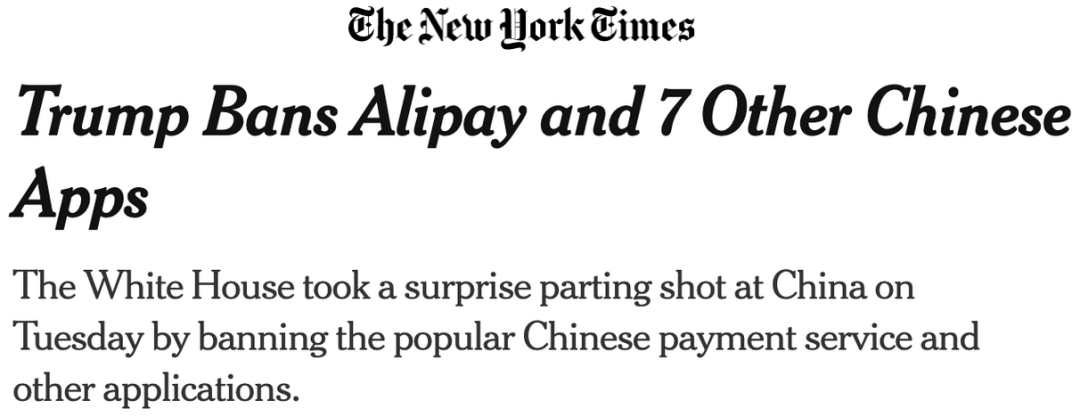 最新突发快讯!据《纽约时报》报道,美国总统特朗普于当地时间1月5日签署了一项行政命令,禁止与8种中国软件应用程序进行交易,其中包括两大支付平台:蚂蚁集团旗下的支付宝和腾讯旗下的微信支付。