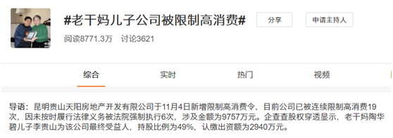 多家媒体发现,昆明贵山天阳房地产开发有限公司(以下简称“贵山天阳”)在11月4日新增一条限制高消费令。至此,该公司已被连续限制高消费19次,因未按时履行法律义务被法院强制执行6次,涉及金额约为9757万元。企查查资料显示,贵山天阳最终受益人便是“老干妈”陶华碧的大儿子李贵山,其持股比例为49%。