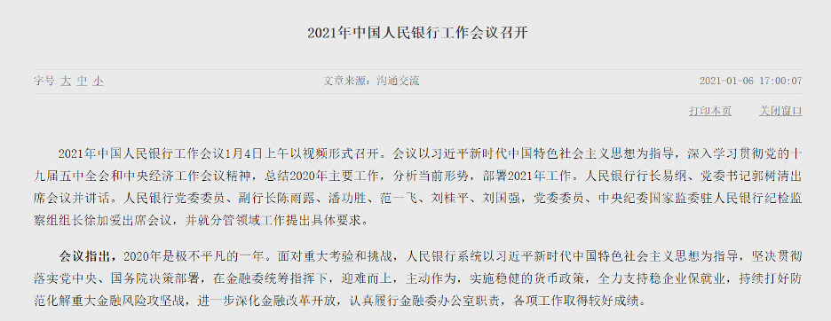据中国人民银行官网今日消息,作为新一年央行工作的“风向标”,2021年央行工作会议于1月4日召开。会议部署了2021年工作十大重点,向市场传递了多个重磅信号。