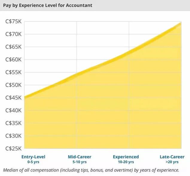 初级会计工作在加拿大的平均年收入是$45000(税前),随着阅历的增长,在5~10年的期间,工资会提升至$60,000-$80,000 的水平。当你在这一行拥有足够多的经验的时候(10~20年),你的平均年收入也会提升到$80,000-$100,000一年。