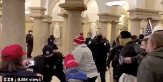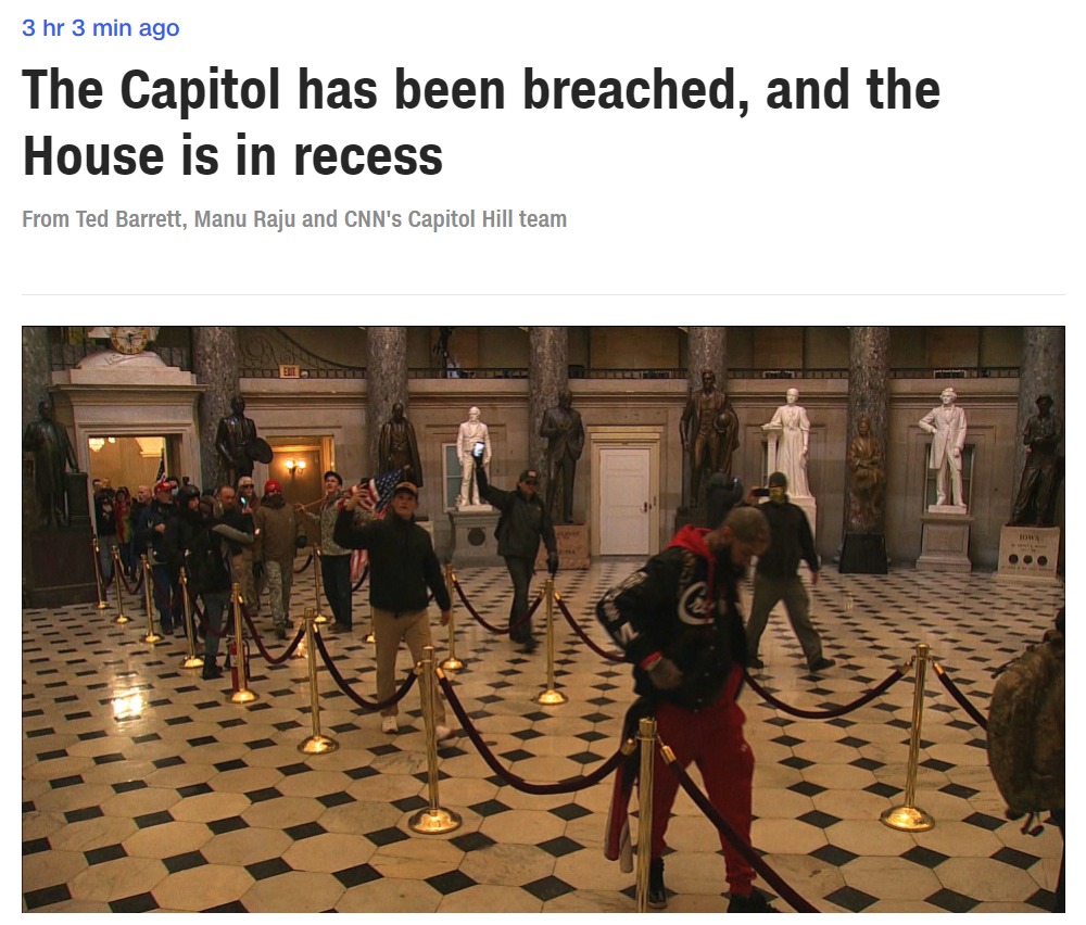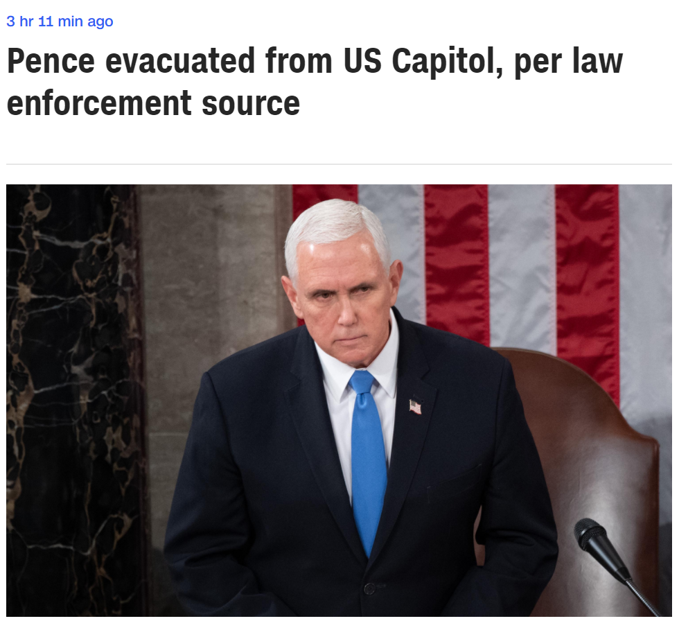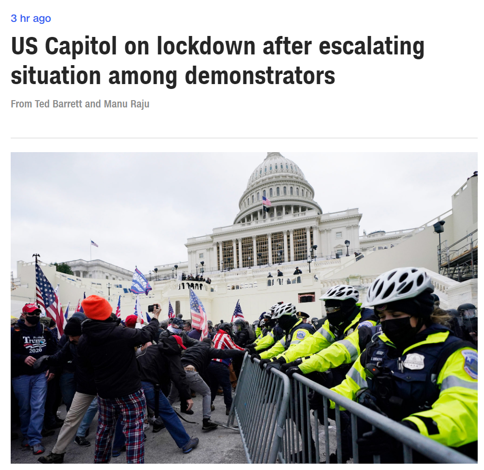 国会里面的人倒是一个个有条不紊地演讲着,但是国会外面的人已经要闹了。美东时间下午2:30分左右,眼见着事态开始升级,警方宣布封锁(lockdown)国会山。但这时,亲特朗普的抗议者就已经在往里面闯了。