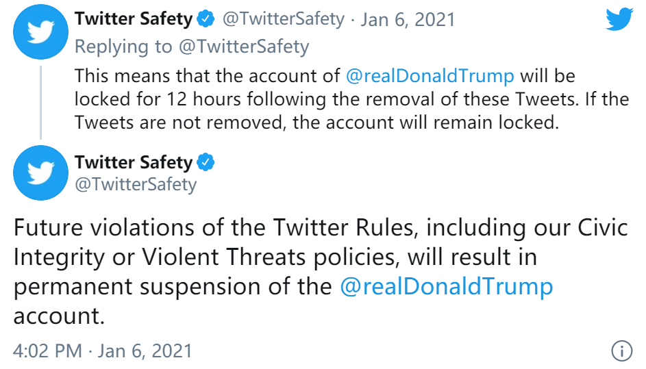 这真的还不如不发……难怪1月6日推特第一次把特朗普的账号封了。先封12个小时,之后再发这种违规内容,直接永久封号。