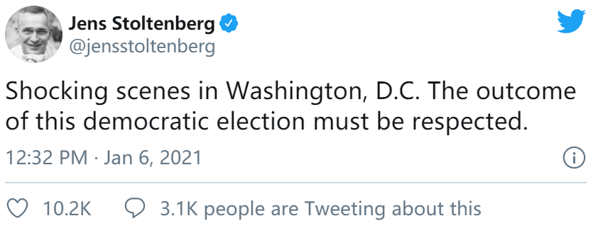 北约秘书长Jens Stoltenberg:“在华盛顿发生的一切令人震惊,民主选举的结果必须被尊重”。