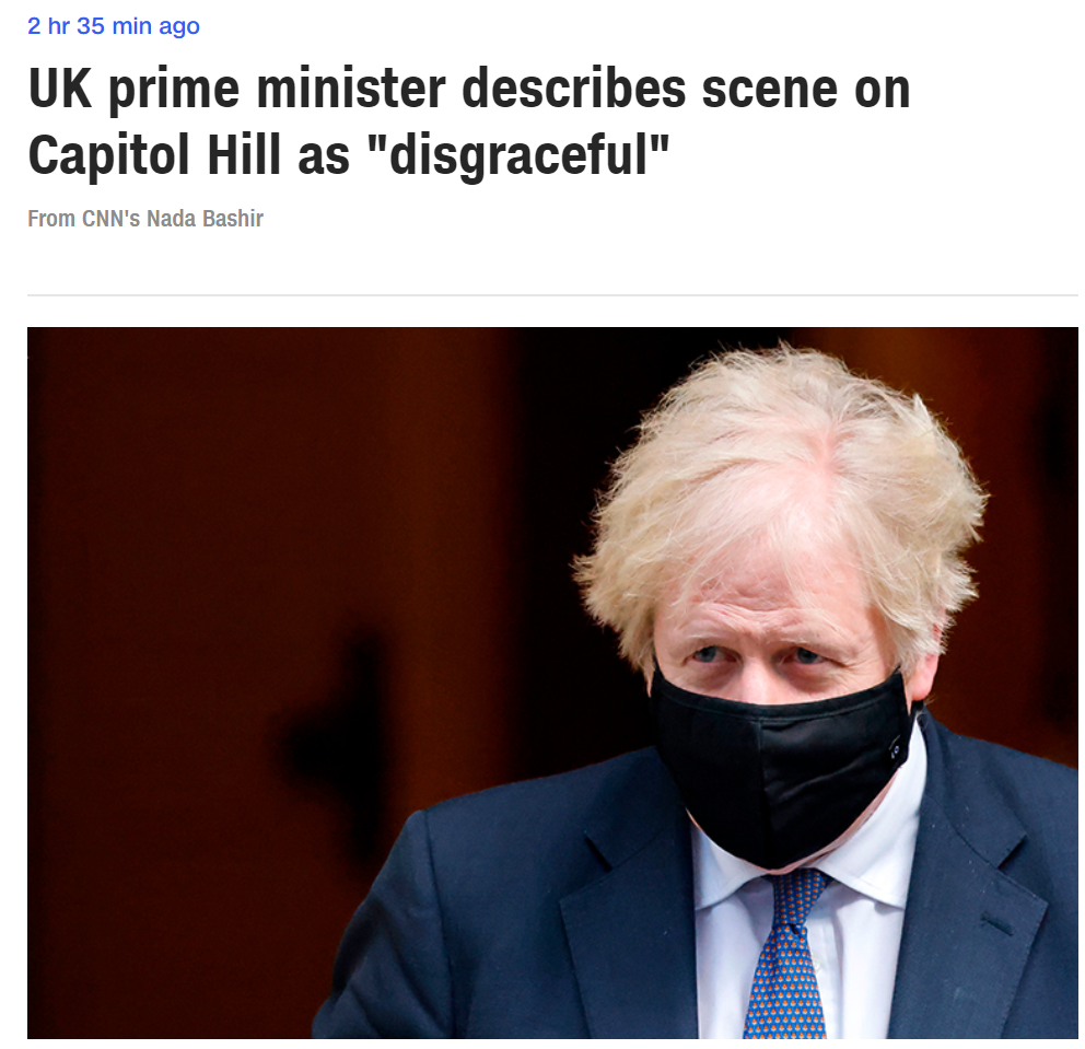 英国首相Boris Johnson称国会山暴乱是美国的耻辱。