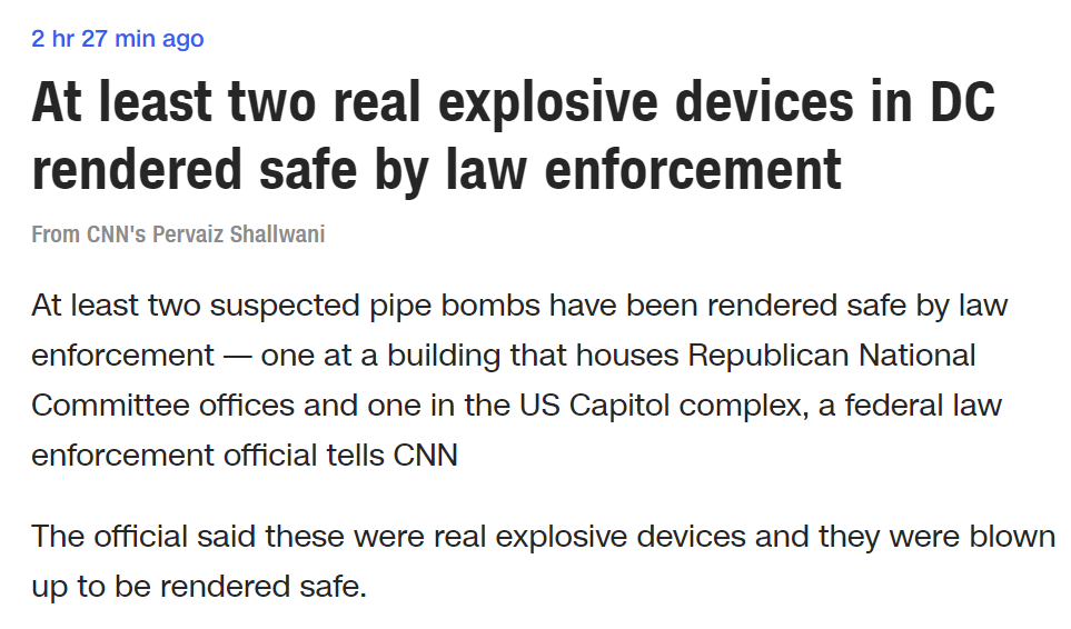 自暴乱开始,警方在不知道发现了多少个疑似爆炸物的可疑包裹,其中至少有两个是真炸弹——一个在共和党国家委员会办公室里,另一个则就在美国国会大厦内。