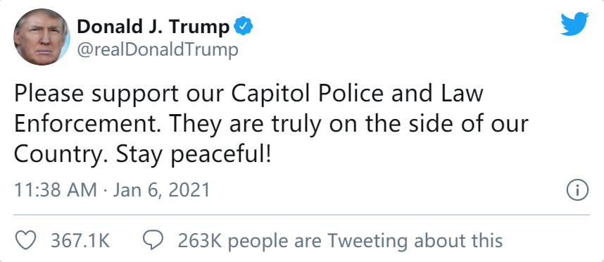 整个过程中,现任美国总统特朗普就发了两条不痛不痒的推特,让支持他的暴民“保持冷静”。这第一条推文发送的时间离抗议人群围住美国国会大厦,也就两个小时吧。