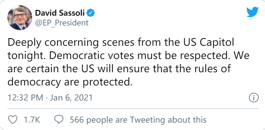 欧盟议会主席David Sassoli:“美国国会山的暴乱太令人担心了,民主投票必须被尊重。我们很确定美国会保护他们自己的规矩”。