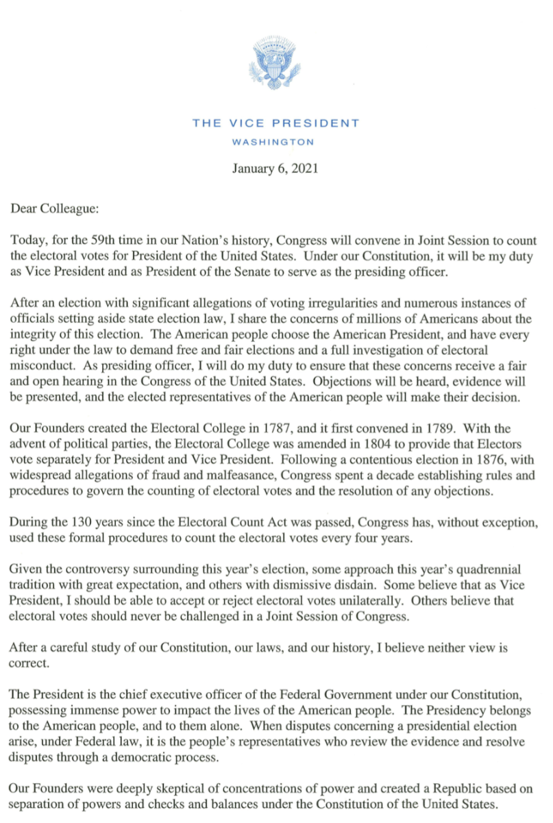 说起来,就算彭斯愿意反对选举人票,法律也说不行——1887年美国法典(U.S. Code)第3篇第1章第15条规定得非常清楚,只有当一个众议院议员和参议院议员联合起来,才能对美国的选举人票表示反对,而且还得是书面形式的。所以彭斯的权力基本上就仅限于坐那儿看,然后最终宣布一下结果。上面他的这封公开信完全是形式大于内容。