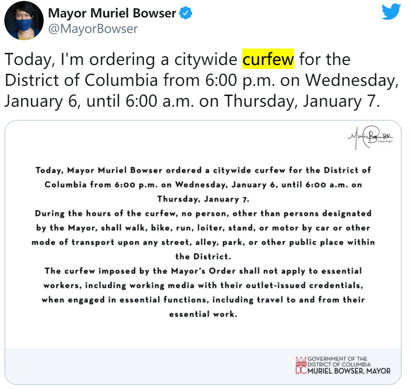 不久后,华盛顿特区市长Muriel Bowser在特区上宣布,1月6日下午6点至7日6点,整个特区实施宵禁。