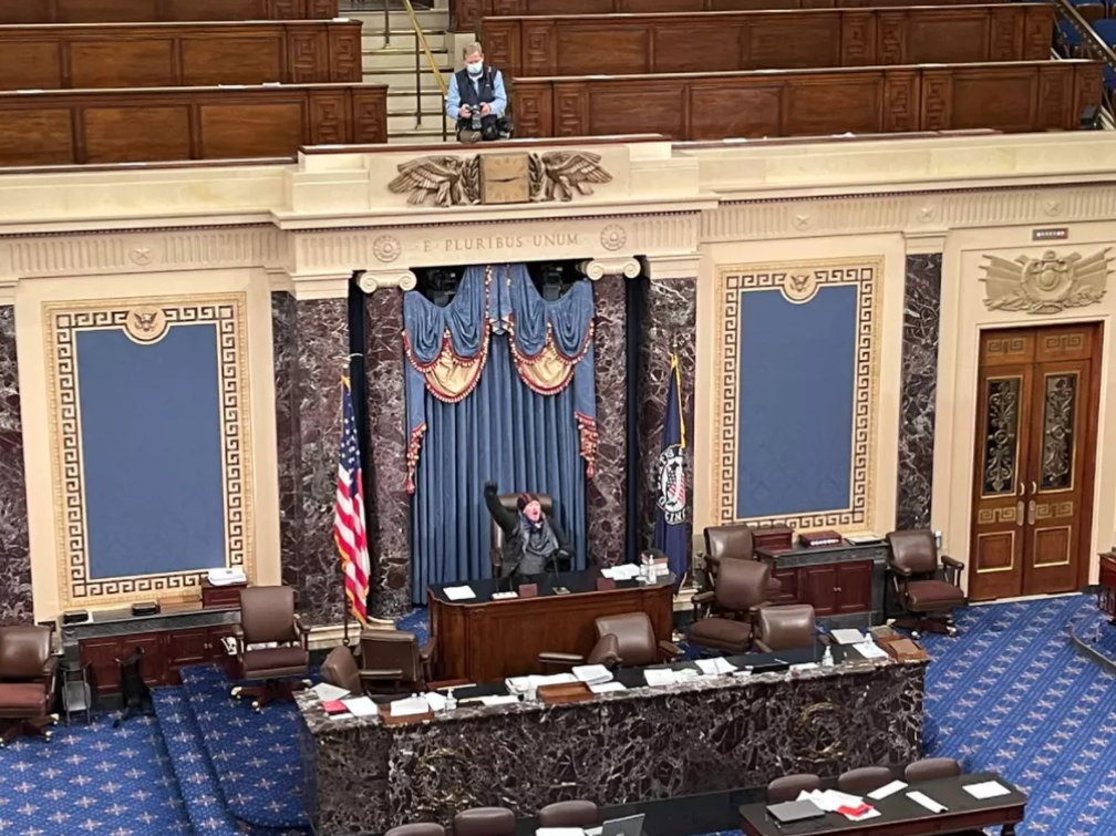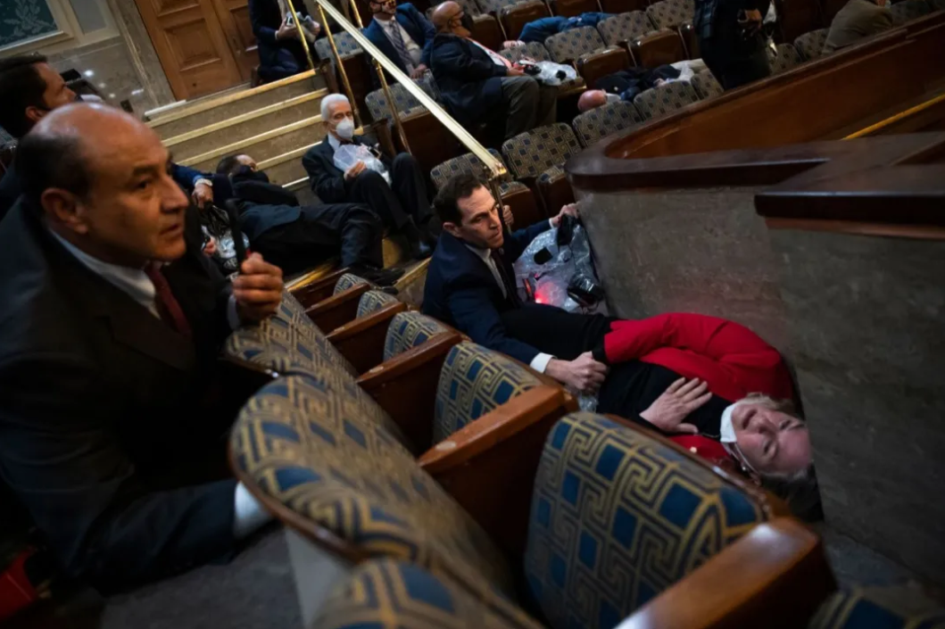 见势不妙,彭斯撤离国会山,选举人票点票也直接暂停。一众参、众两院议员也被疏散。对于那些暂时没来得及疏散的议员,警方只能让他们先躲在椅子下面……