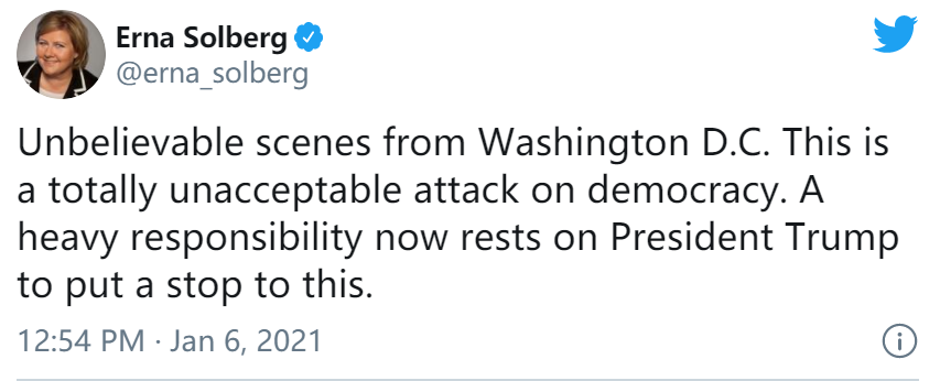 挪威总理Erna Solberg:“在华盛顿特区发生的一切难以置信,这种对民主的攻击完全不可接受。现在,责任落到了特朗普总统的头上,现在需要停止这一切”。