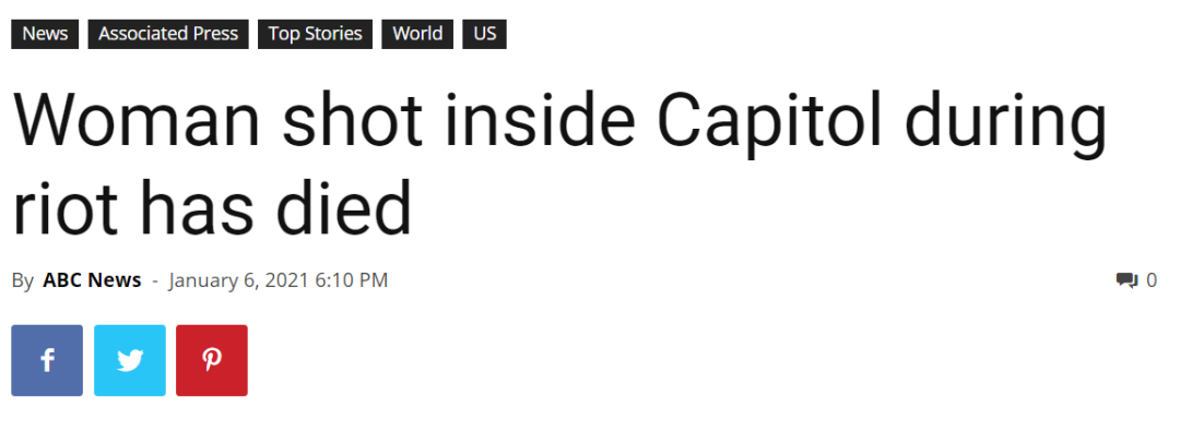 据CNN报道,还有不少抗议者直接带着枪就冲进了国会大楼。在与暴徒对射过程中,美国国会大厦内多名警员受伤,至少有一名被送往医院。据两位知情人士透露,一名女子在国会大厦高层中弹,不久便被警方宣告死亡。