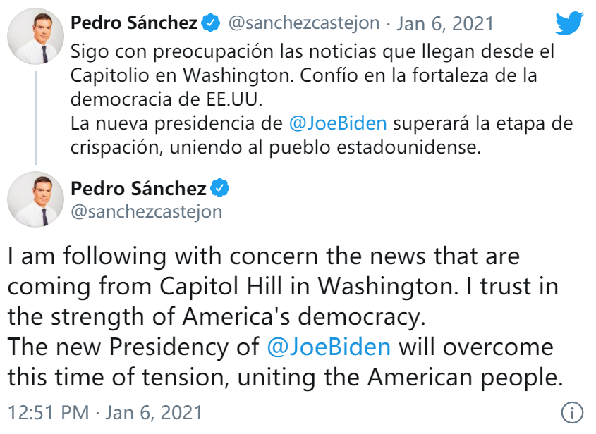 西班牙总理Pedro Sanchez:“我正在持续关注美国国会暴乱一事,我相信美国民主的力量。新任总统拜登会克服目前的紧张局势并团结美国人民”。